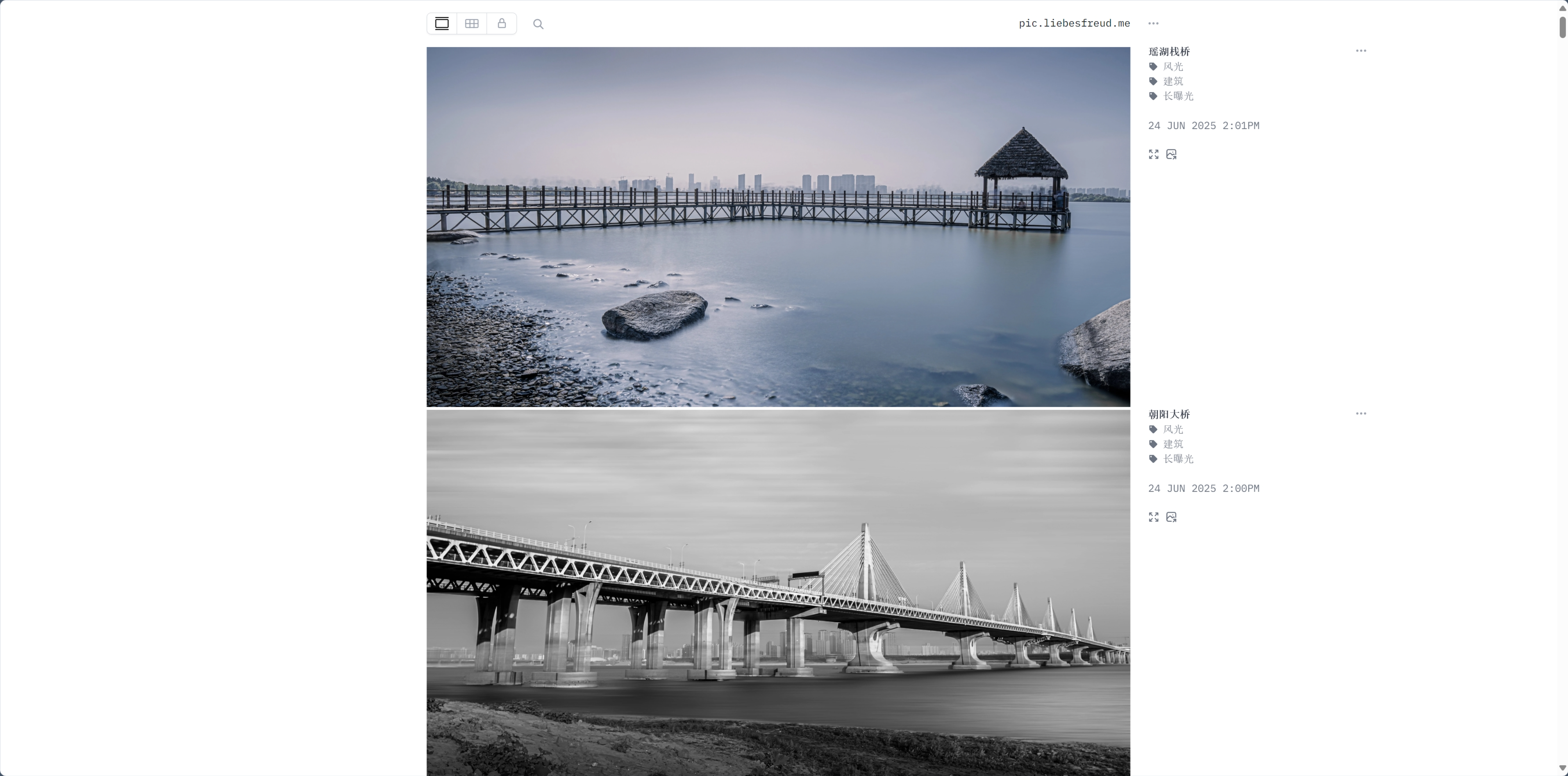 那么?我的需求逐渐明晰,我需要一个便于分享、能够保存高质量照片、最好还是能够自托管的相册。拥有这样需求的人不在少数,也有十分优秀的项目例如PicImpact或是exif-gallery-nuxt,那么在体验过一段时间后,我最终选择exif-photo-blog这个项目。