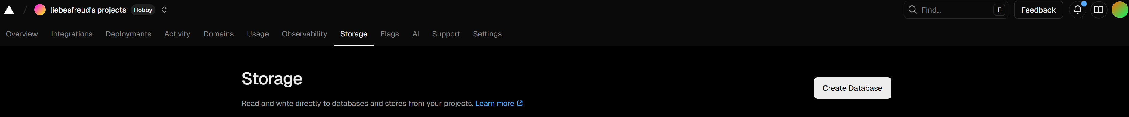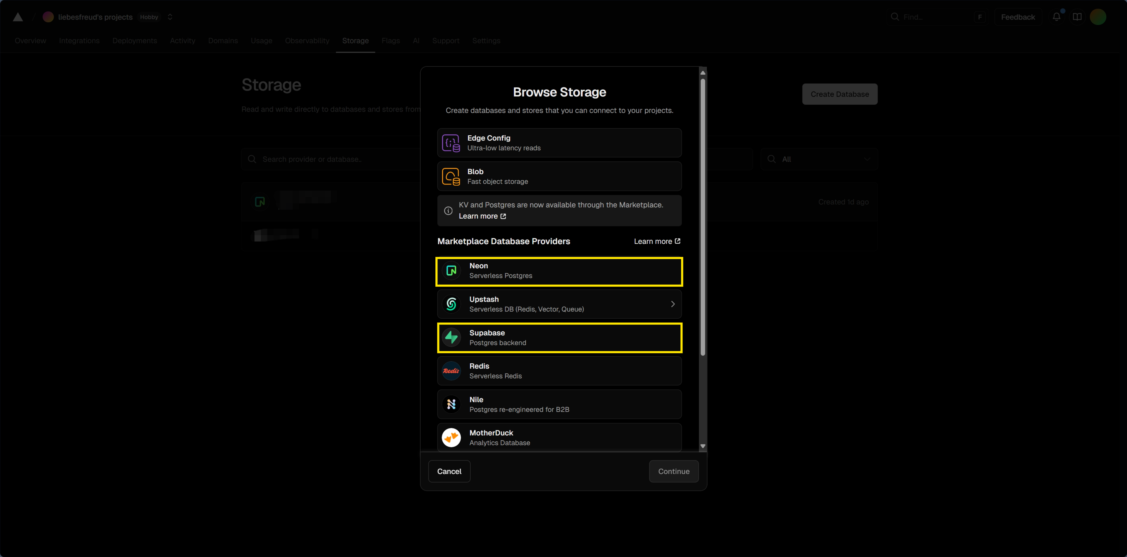在项目界面中打开Storage选项卡,开始创建并链接你的数据库吧。我建议你使用Vercel提供的Neon或Supabase,它们都有一定的免费额度,对于一个个人使用的相册而言绰绰有余。