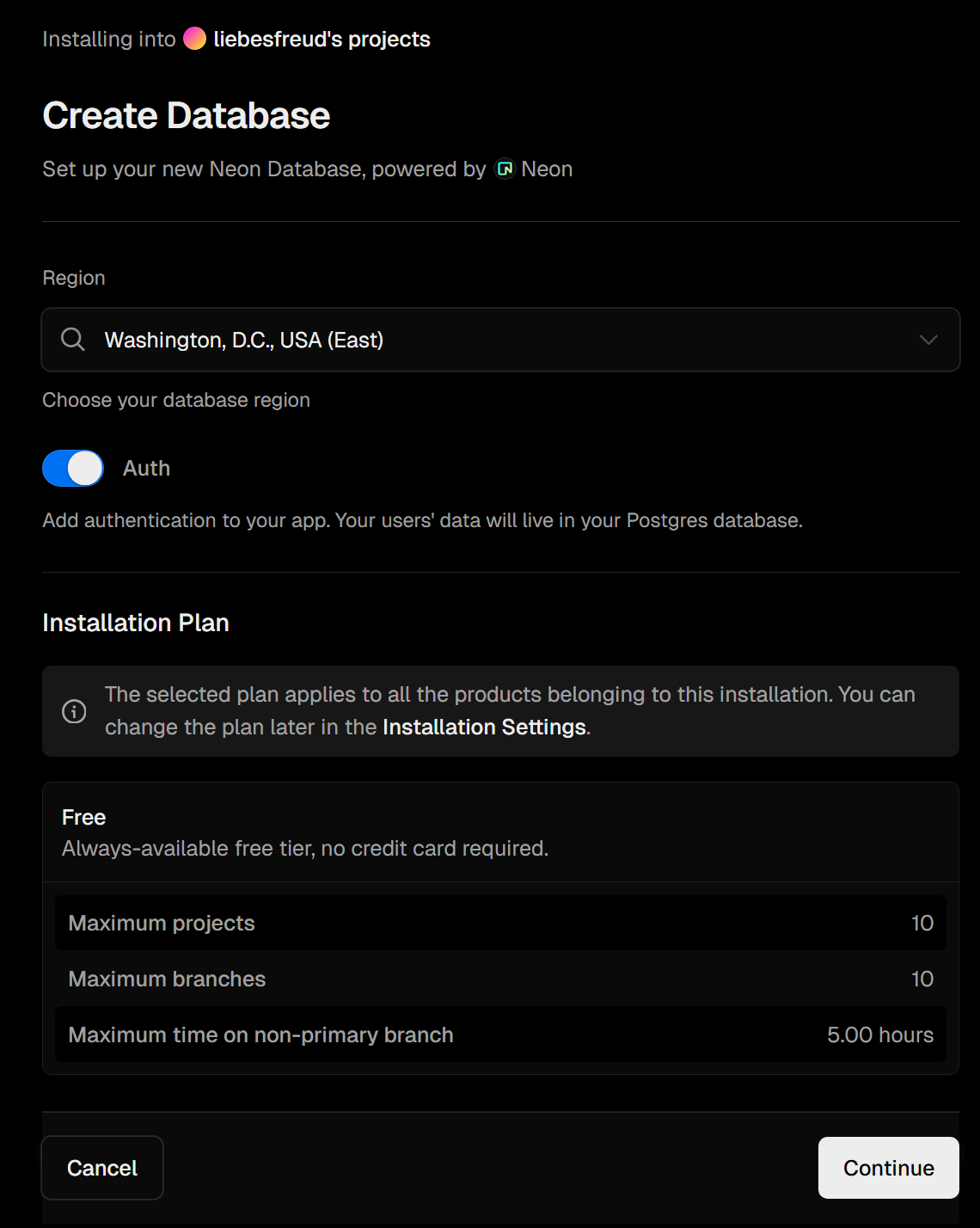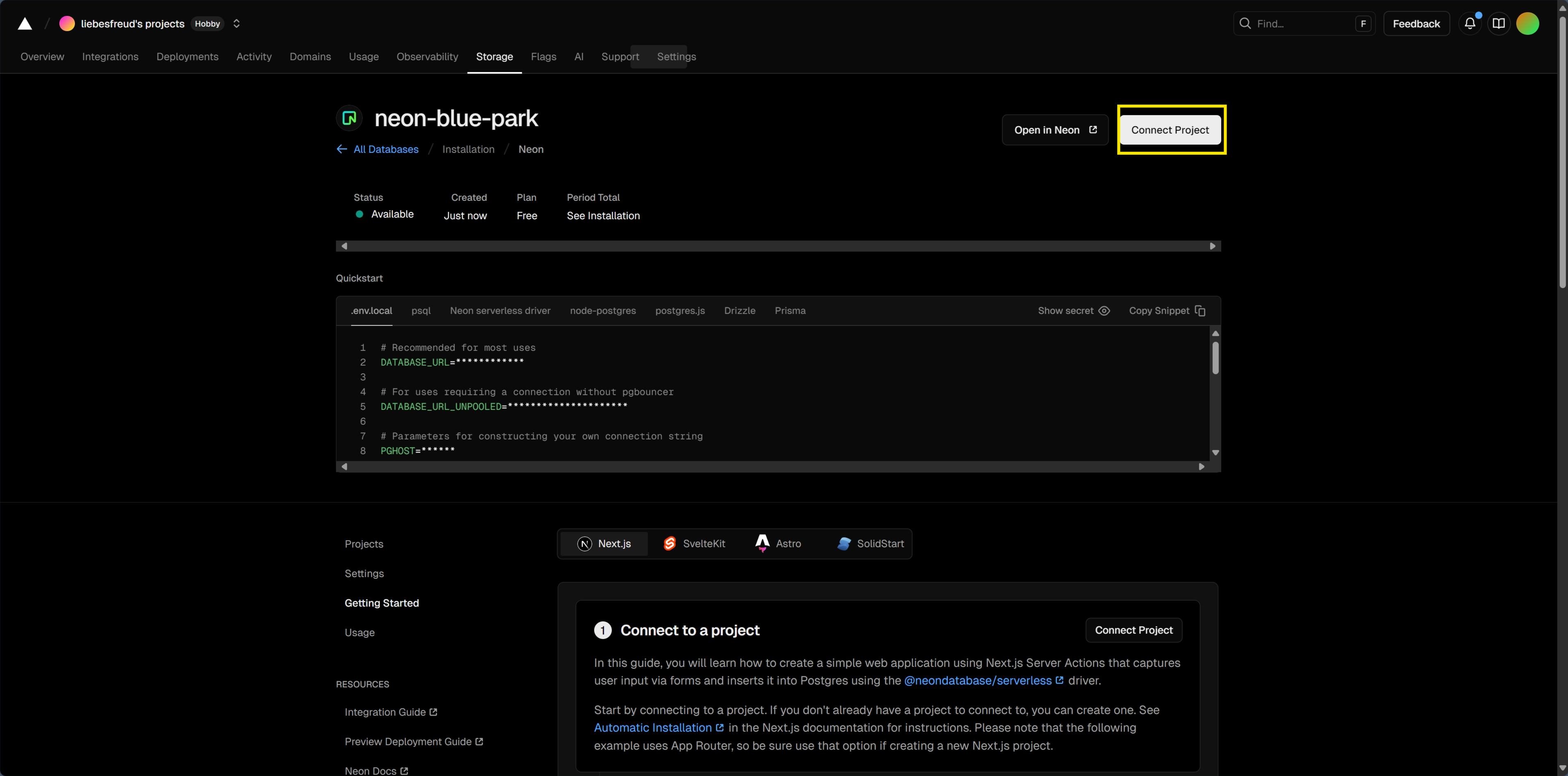 以Neon为例,选择合适的地区并创建,完成后,你可以很轻松的将其链接到项目: