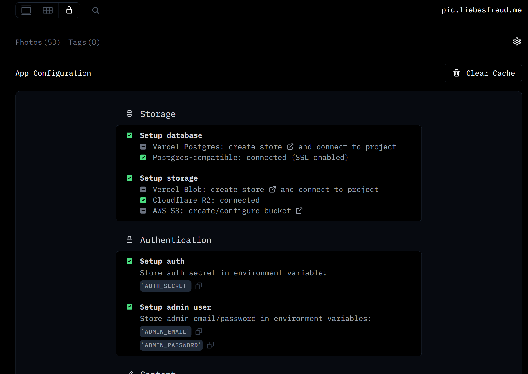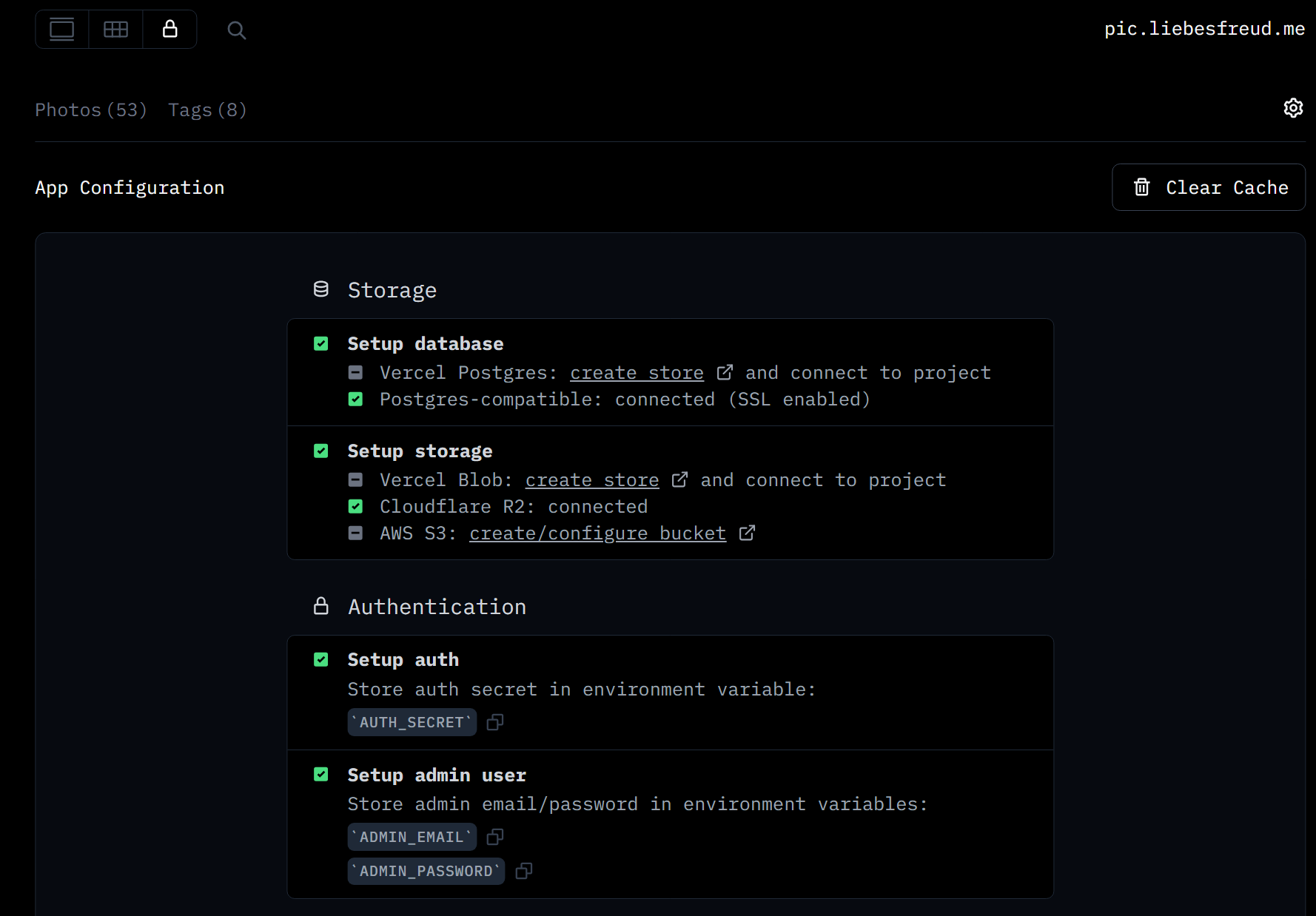 此时你已经可以通过Vercel提供的域名访问你的相册了,你大概会进入这样的界面,当你配置完Storage(数据库和对象存储)、Authentication后,会在对应的条件前打勾: