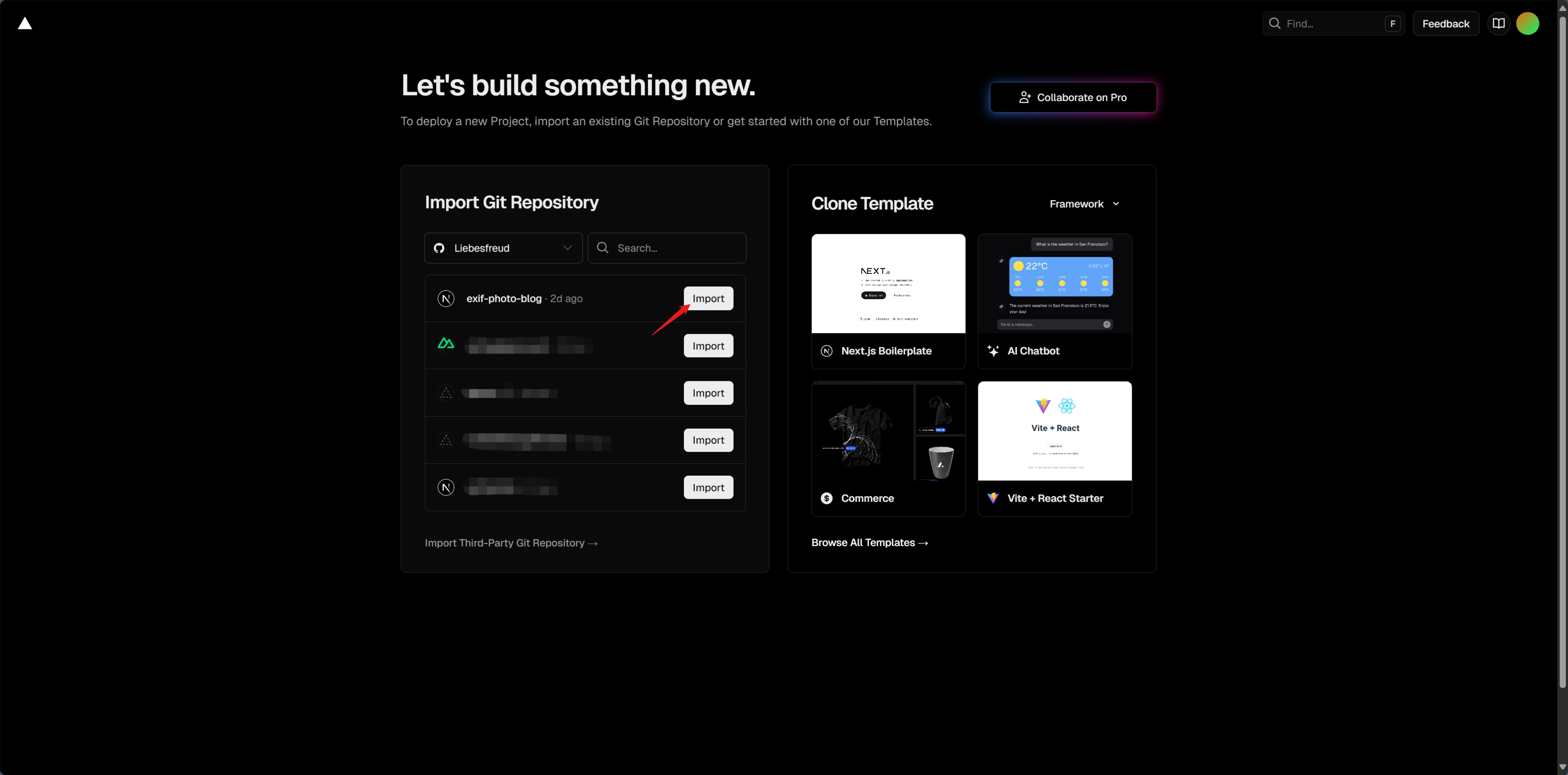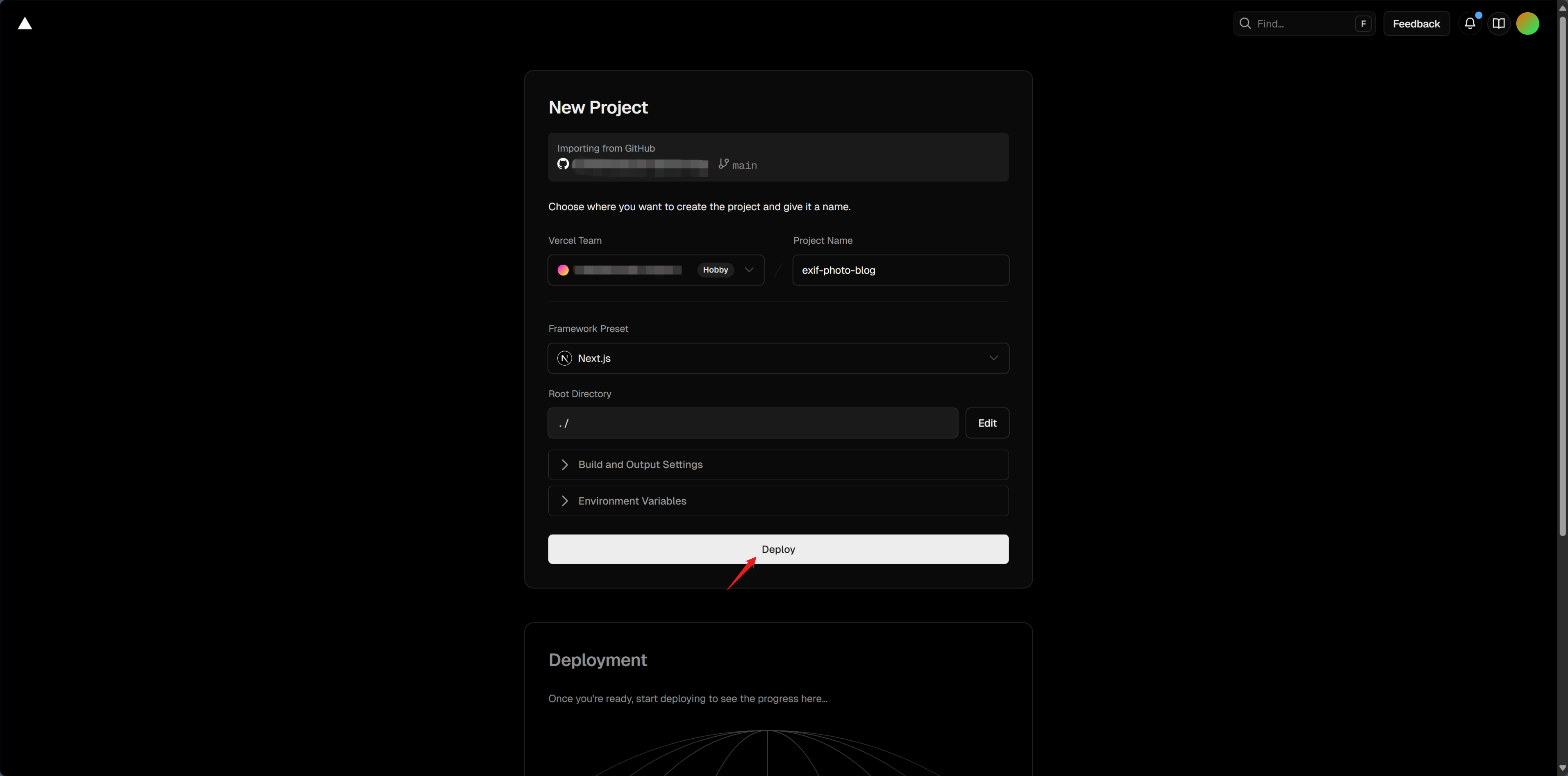 项目主页提供了在Vercel上一键部署的按钮,你也可以fork项目后在Vercel手动部署,点此直达Vercel新建项目,部署时无需任何改动,在等待大约两分钟后即可部署完毕。