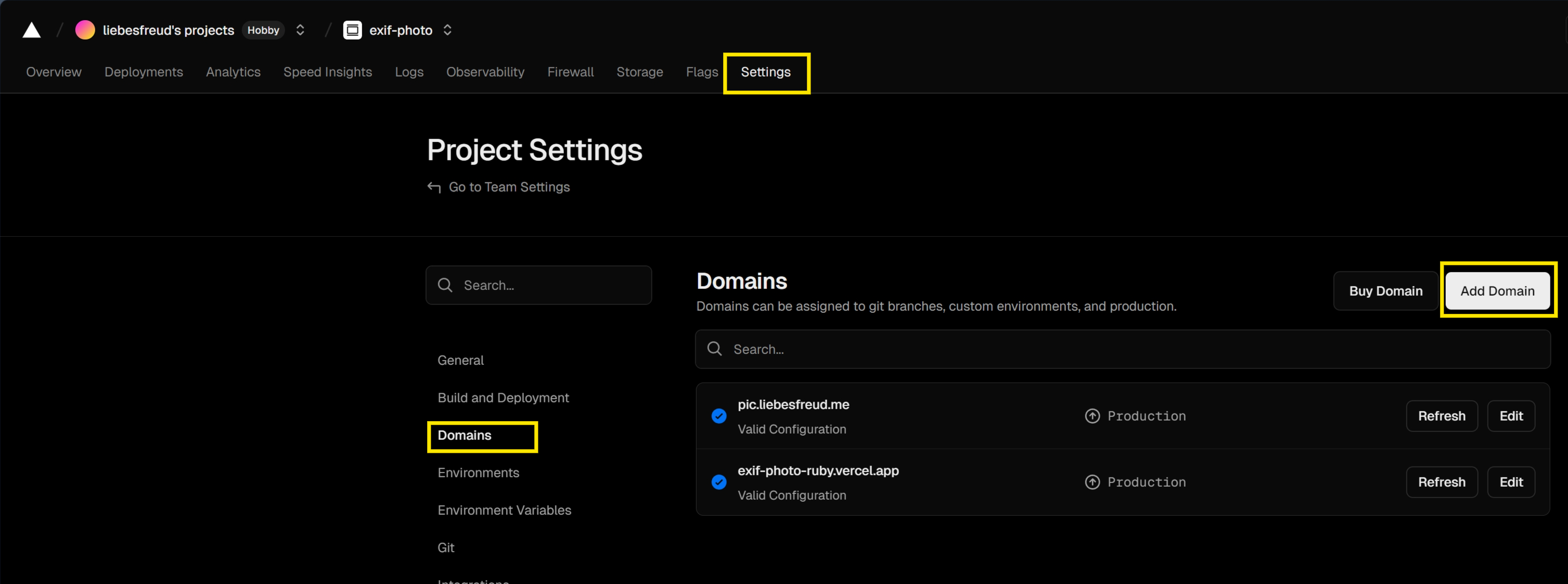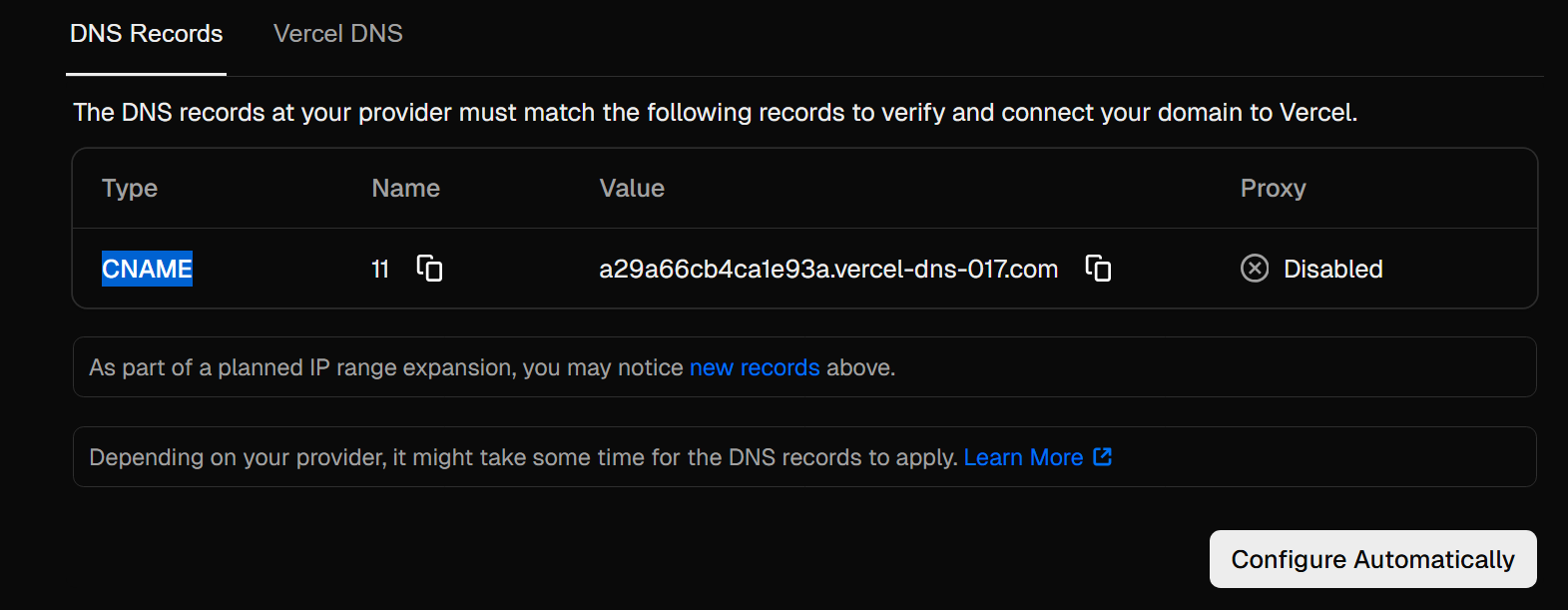 Vercel为你提供的域名难以记忆,且在中国大陆访问受限,建议绑定一个自己的域名,跟随步骤在你域名DNS中添加CNAME记录: