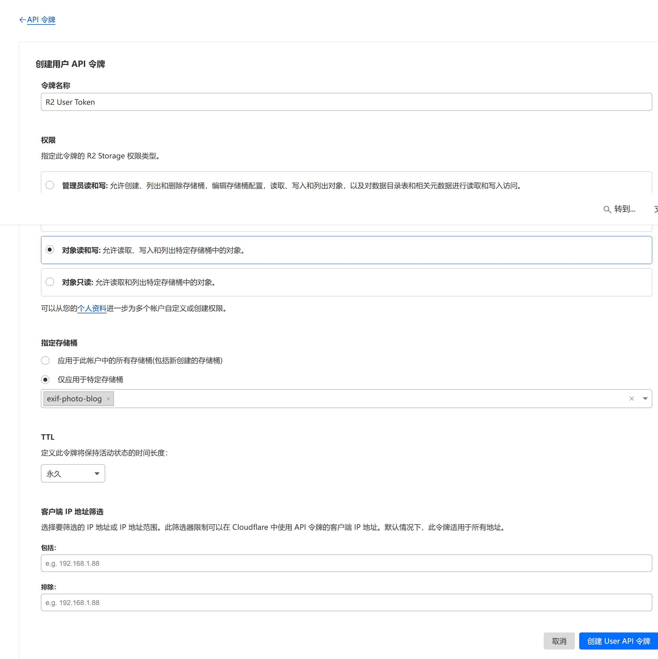 通过选择“Manage R2 API Tokens”并单击“Create API Token”来创建 API 令牌。
