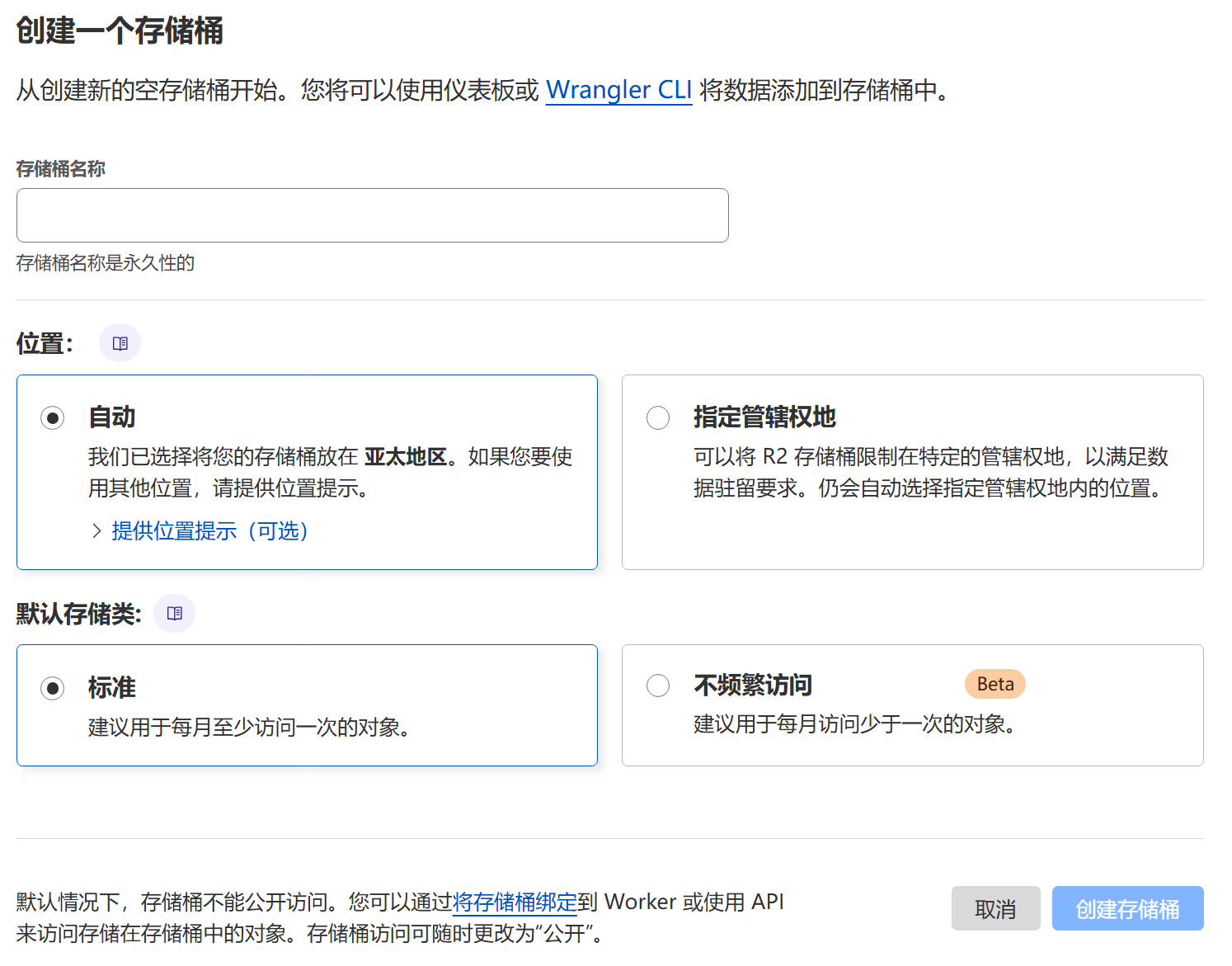 在Cloudflare中创建一个R2存储桶,选项皆为默认,无需更改。